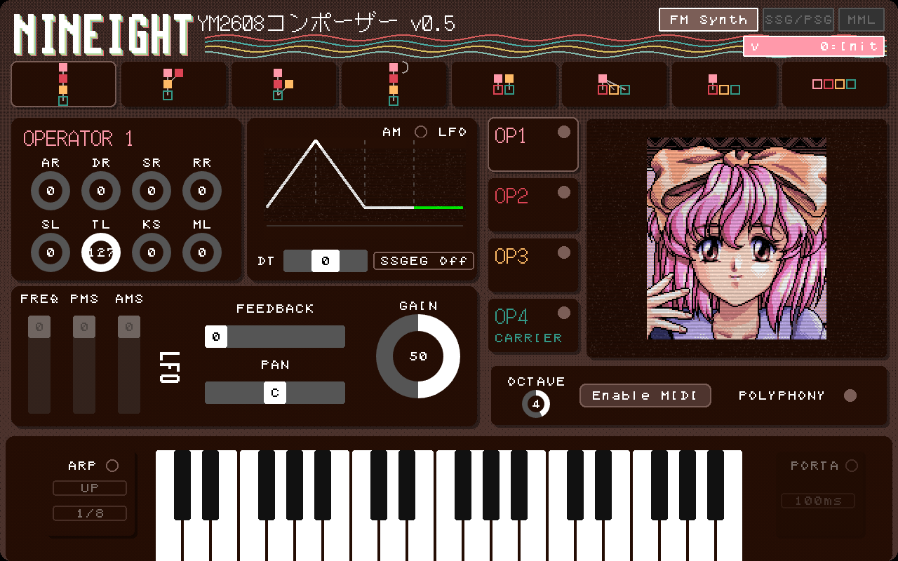 NINEIGHT is still in development. I am working on an MML editor to compose melodies, which is where the “Composer” in the title comes from. It will allow importing FM, SSG, and ADPCM instruments in order to create songs.